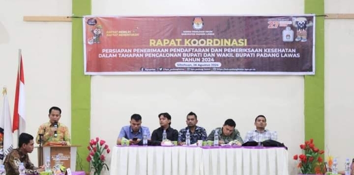 Padang Lawas, 86News.co – Komisi Pemilihan Umum (KPU) Kabupaten Padang Lawas melaksanakan rapat koordinasi persiapan penerimaan pendataan dan pemeriksaan kesehatan dalam tahapan pencalonan Bupati dan Wakil Bupati pada pemilihan serentak tahun 2024 di Hotel Al-Marwah Sibuhuan. Senin malam (26/08/24).
