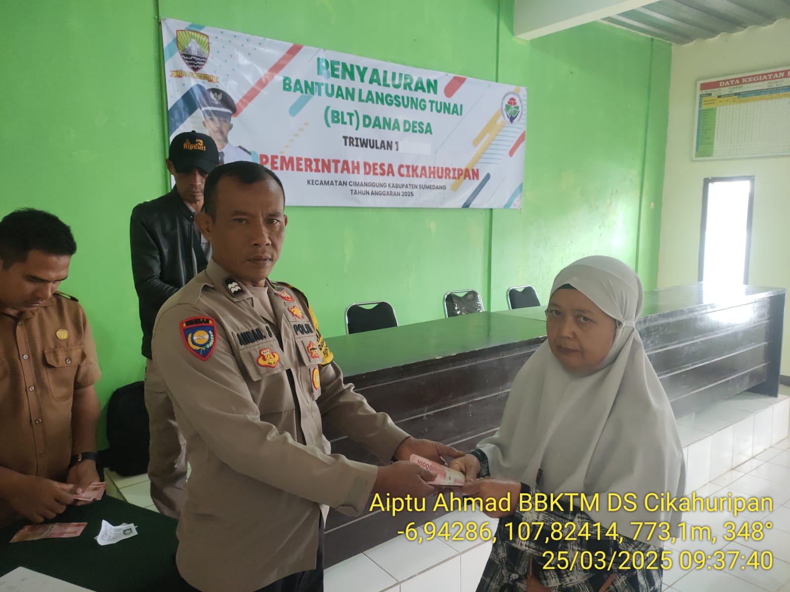 86news co.Sumedang – Bertempat di aula kantor Desa Cikahuripan Kecamatan Cimanggung Kabupaten Sumedang. Bhabinkamtibmas Desa Cikahuripan Polsek Cimanggung Polres Sumedang Polda Jabar AIPTU AHMAD SUBEKTI , melaksanakan monitoring kegiatan penyaluran Bantuan Langsung Tunai (BLT) Dana Desa (DD) berupa uang tunai sebesar Rp300.000,- (tiga ratus ribu rupiah) per bulan kepada warga Desa Cikahuripan Kecamatan Cimanggung Kabupaten Sumedang. Selasa (25/03/2025).