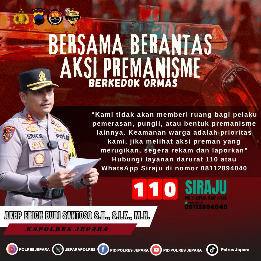 “Kami mengajak masyarakat untuk tidak diam bila melihat tindakan premanisme. Segera laporkan ke Call Center 110 atau WhatsApp Siraju di nomor 08112894040. Layanan ini gratis dan tersedia 24 jam. Untuk identitas pelapor akan dirahasiakan,” ujar Kasihumas AKP Dwi saat ditemui di Jepara, Kamis (15/5/2025).