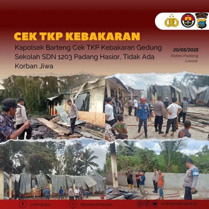 Padang lawas, 86News.co — Kepolisian Resor Padang Lawas (Polres Palas) lewat Jajaran Kepolisian Sektor Barumun Tengah (Polsek Barteng) yang dipimipin langsung Kapolsek Barteng AKP Rahmad Saleh Nainggolan, SH, bersama Personil melakukan Pengecekan, pemeriksaan lokasi TKP kebakaran yang menghanguskan satu unit Bangunan SDN 1203 Padang Hasior, yang terdiri dari tujuah ruang kelas di Desa Padang Hasior Lombang, Kecamatan Sihapas Barumun, Kabupaten Palas. Pada Senin, (19/05/2025), sekitar pukul 13.00 WIB.