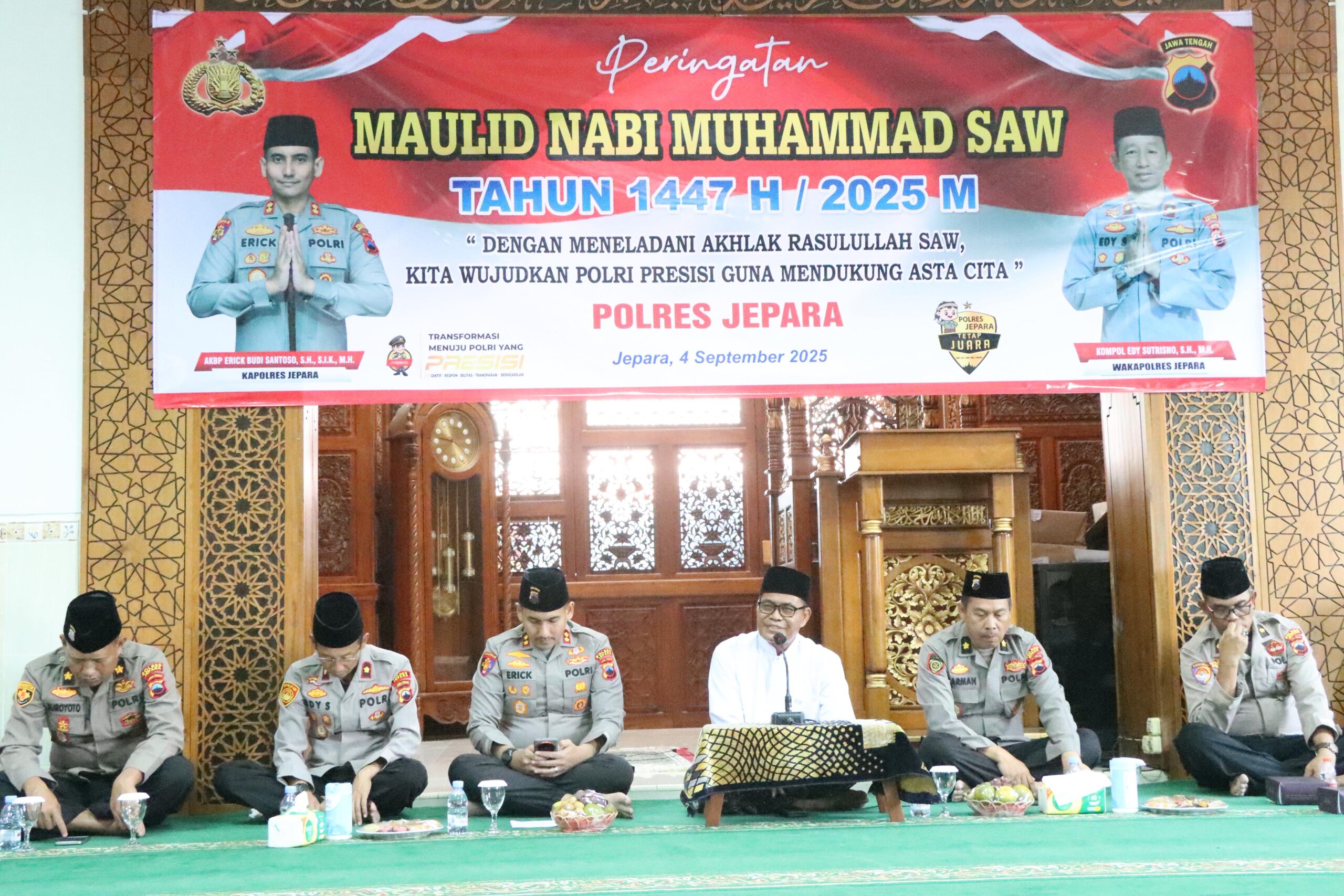 Kapolres Jepara AKBP Erick pun menyampaikan apresiasi atas terselenggaranya peringatan Maulid ini. Menurutnya, nilai kejujuran, amanah, dan kepedulian sosial yang diwariskan Rasulullah adalah pedoman penting bagi Polri.