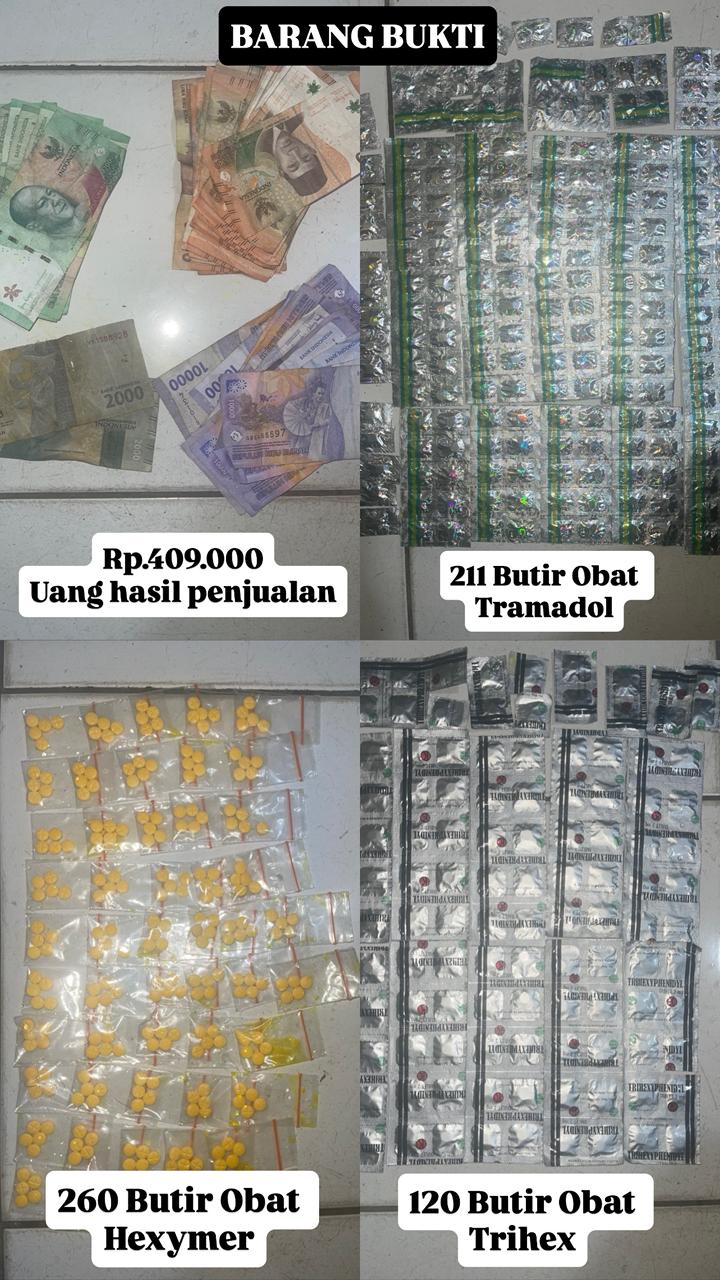211 butir Tramadol 260 butir Hexymer.120 butir Trihexyphenidyl.Uang tunai Rp409.000 hasil penjualan obat