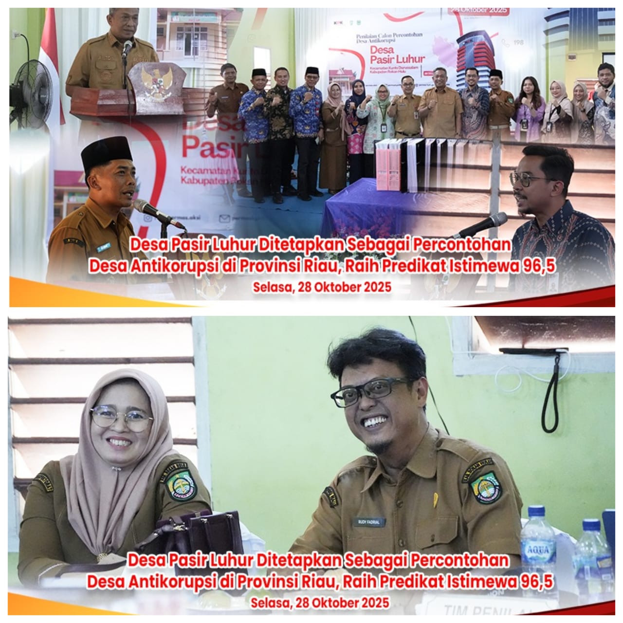 Bupati Rokan Hulu, Anton, ST., M.M menyampaikan apresiasi setinggi-tingginya kepada seluruh perangkat desa, BPD, dan masyarakat Pasir Luhur yang berhasil menunjukkan kinerja dan komitmen luar biasa terhadap tata kelola pemerintahan yang bersih. “Pemkab Rokan Hulu berkomitmen mendukung penuh program KPK dan Pemerintah Pusat dalam mewujudkan desa antikorupsi,” tegas Bupati Anton.