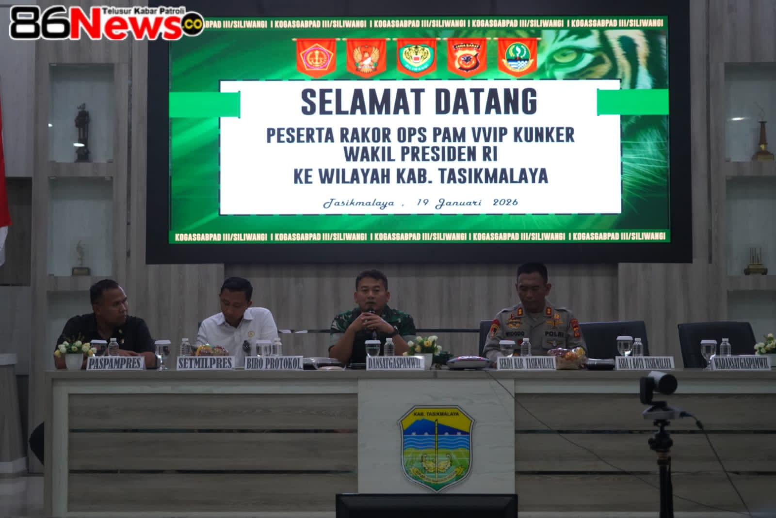 Kab.Tasikmalaya, 86News.co – Komandan Korem 062/Tn Kolonel Inf Dadi Sutandi, S.E., M.M., memimpin Rapat Koordinasi Wilayah (Rakorwil) dan Rapat Koordinasi Pengamanan (Rakorpam) serta Apel Gelar Pasukan dalam rangka kunjungan kerja Wakil Presiden RI di wilayah Korem 062/Tn. Bertempat di Gedung Rapat Kantor Sekda Kab.Tasikmalaya, Senin (19/1/2026).