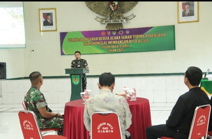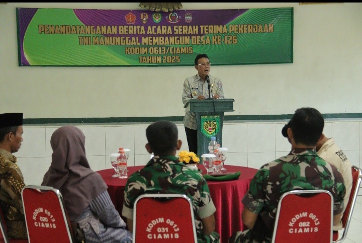 Ciamis, 86news.co – Program TNI Manunggal Membangun Desa (TMMD) ke-126 Tahun 2025 secara resmi diserahkan kepada Pemerintah Kabupaten Ciamis dalam sebuah seremoni yang berlangsung khidmat di Aula Kodim 0613/Ciamis, Jumat (10/04/2026) pagi. Kegiatan ini menjadi penanda berakhirnya seluruh rangkaian pelaksanaan TMMD yang dipusatkan di Desa Sukamulya, Kecamatan Purwadadi.