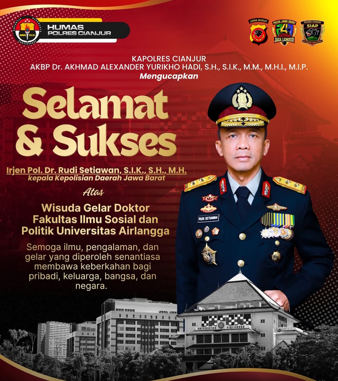 86News.co – Keluarga Besar Polres Cianjur turut bangga dan mengucapkan Selamat & Sukses kepada Bapak Kapolda Jawa Barat, Irjen. Pol. Dr. Rudi Setiawan, S.I.K., S.H., M.H., atas pencapaian gelar Doktor di Universitas Airlangga.