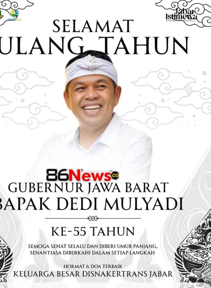 JAWA BARAT -86News co. – Seluruh keluarga besar Dinas Tenaga Kerja dan Transmigrasi (Disnakertrans) Provinsi Jawa Barat menyampaikan ucapan selamat ulang tahun yang tulus dan hangat kepada pemimpin daerah, Bapak Dedi Mulyadi, Gubernur Jawa Barat. Kamis 09/04/2026