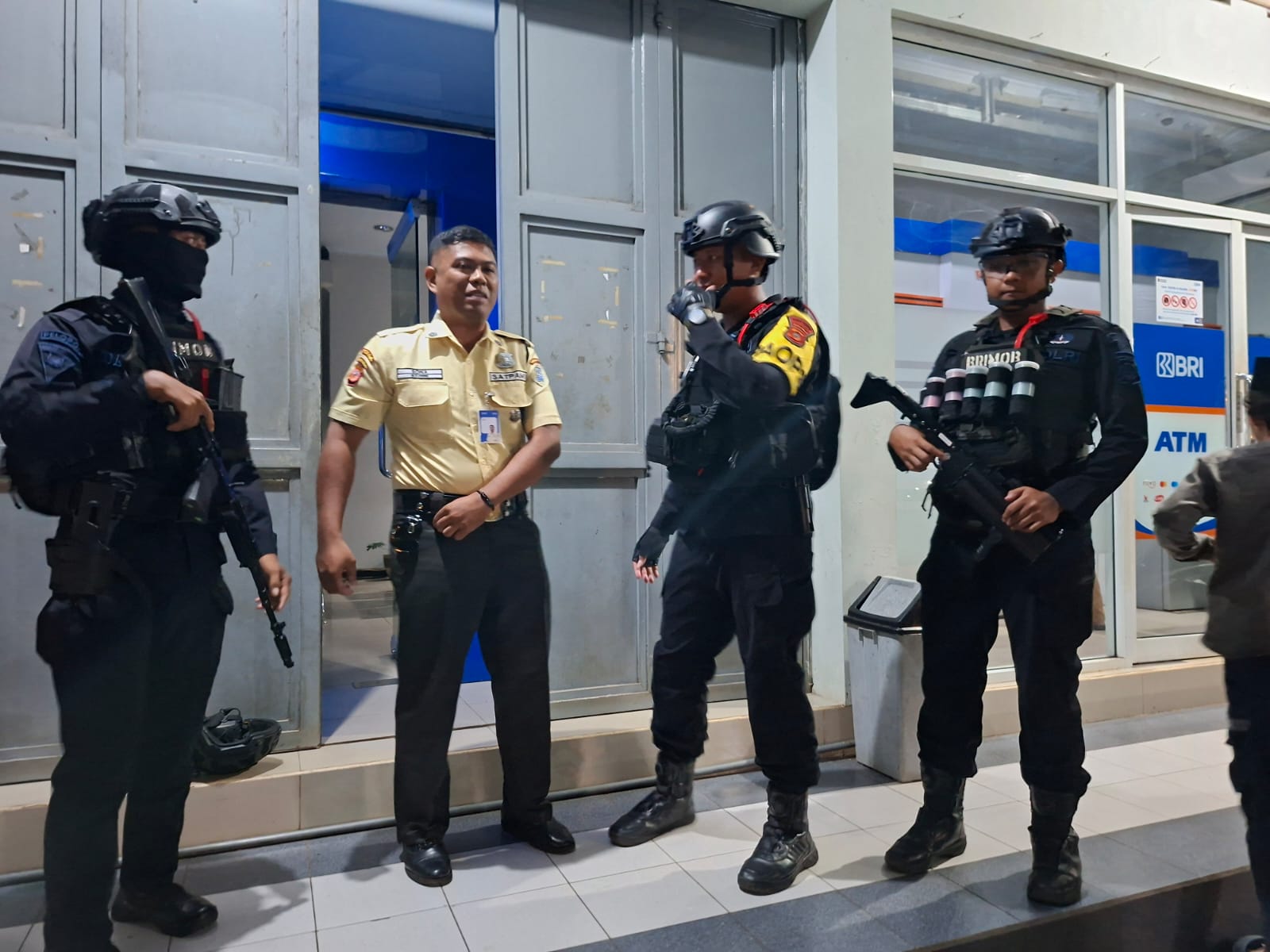 Memasuki pukul 21.30 WIB, patroli dilanjutkan ke objek vital, salah satunya Bank BRI. Dalam kesempatan tersebut, personel Brimob juga melaksanakan patroli dialogis dengan petugas keamanan (security), menggali informasi serta memastikan situasi di sekitar tetap aman dan terkendali.