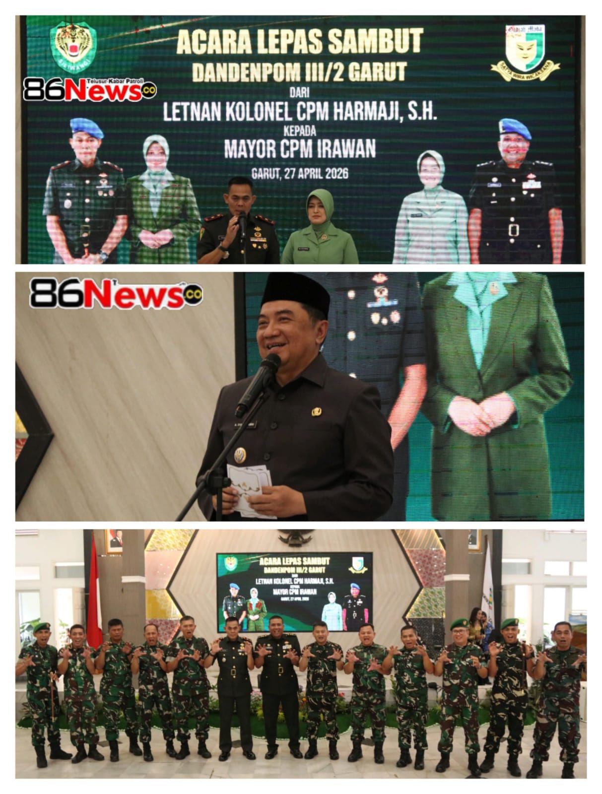 GARUT, Garut Kota -86News co.– Bupati Garut, Abdusy Syakur Amin, menghadiri acara Pisah Sambut Komandan Detasemen Polisi Militer (Dandenpom) III/2 Garut dari Letnan Kolonel (Letkol) CPM Harmaji kepada Mayor CPM Irawan. Acara silaturahmi ini berlangsung khidmat di Gedung Pendopo Kabupaten Garut, Jalan Kiansantang, Kecamatan Garut Kota, Senin (27/4/2026).