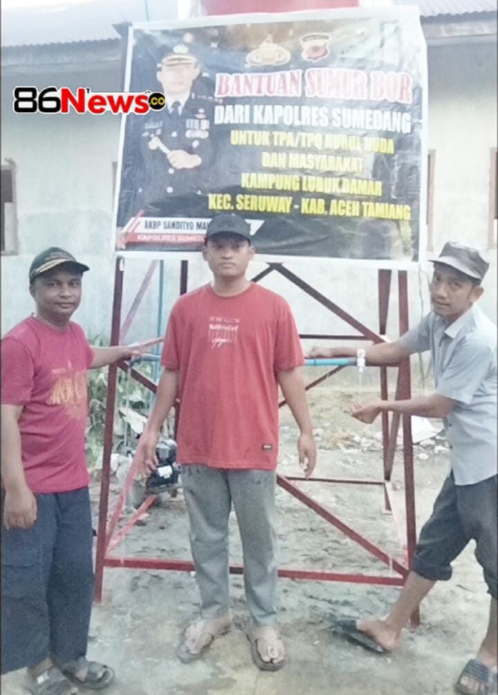Sumedang -86News co. — Rasa syukur dan apresiasi disampaikan oleh masyarakat Desa Lubuk Damar, Kabupaten Aceh Tamiang, atas bantuan sarana air bersih berupa sumur bor lengkap yang diberikan oleh jajaran Polres Sumedang, pada Selasa, 28 April 2026.