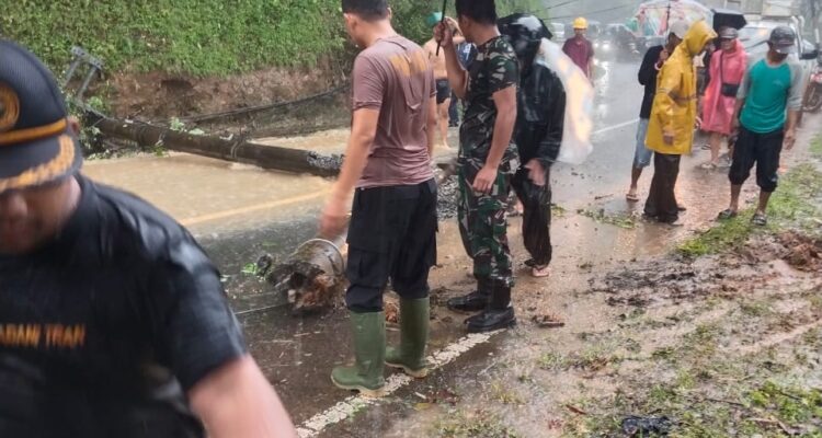 Polsek Cisompet Evakuasi Tanah Longsor dan Tiang Listrik Tumbang di Jalan Raya Garut–Cisompet